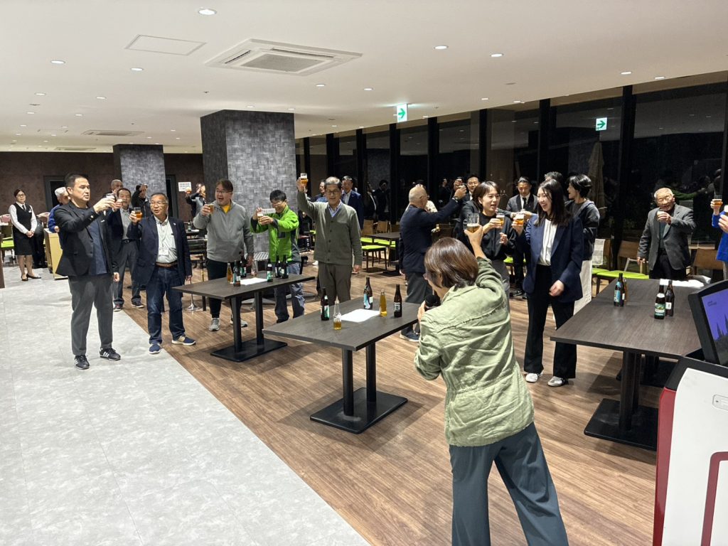 情報交換会での乾杯の様子。笑顔と活気にあふれたひとときでした。
